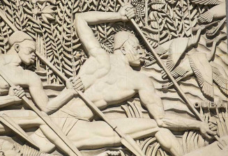 This was not a simple utilitarian vision of the colonies: hippopotamus hunts, African canoers, North African weavers, the vernacular arts represented by Asian statuettes, harvesting food, all these things illustrate local and traditional know-hows, far-removed from the farming methods of the colonists (intensive crop-growing, mechanised production and transport…). Wild animals are abundantly present on the bas-relief (elephants, lions, antelopes, tiger fighting a python, monkeys…) and are not subjected to colonial exploitation.